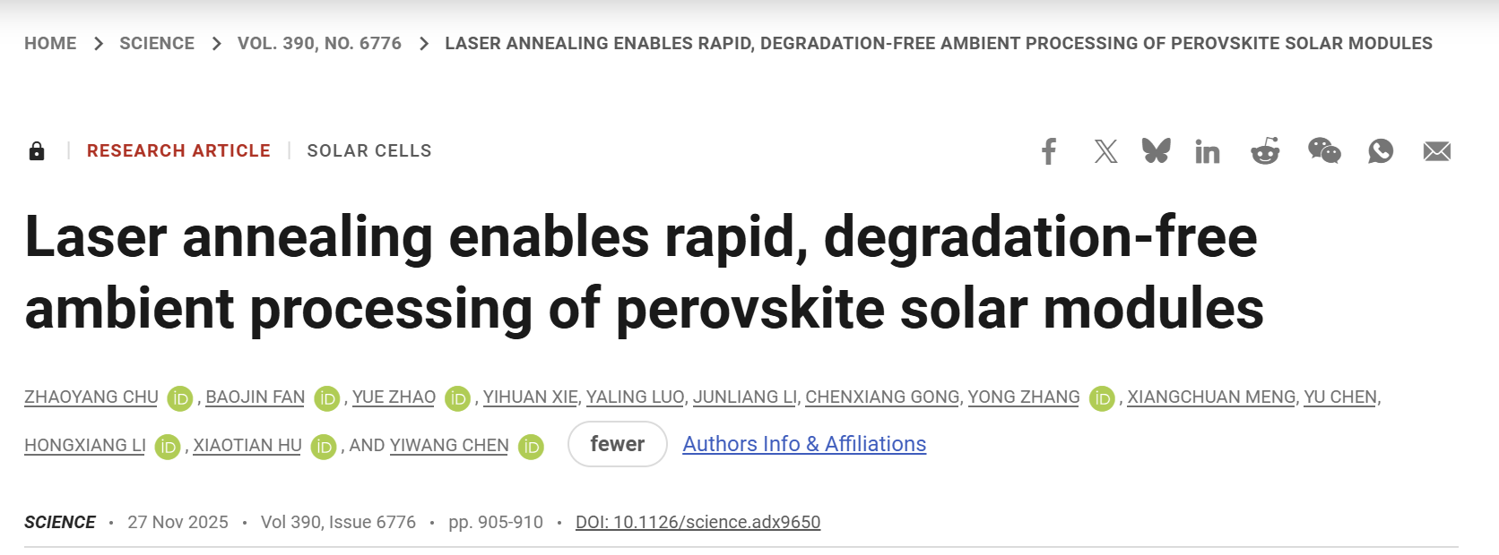 近日,我院陈义旺教授、胡笑添教授团队在新型薄膜太阳能电池领域取得重要突破,研究成果以题为Laser annealing enables rapid, degradation-free ambient processing of perovskite solar modules的论文发表在国际顶级期刊《Science》上。该研究创新性地提出并实现了一种可在空气环境下进行的激光退火(Laser Annealing技术,为钙钛矿光伏材料的大规模、低成本和高稳定性制备提供了关键科学基础和技术路径。