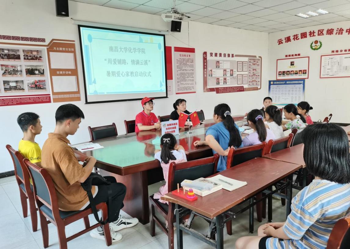 7月6日上午,志愿者们满怀激情从南昌大学前湖校区出发,于8时30分抵达云溪花园。9时整,南昌大学化学学院云溪暑期社会实践活动之爱心家教启动仪式于云溪社区居民委员会活动室正式开展,云溪花园负责人丁主任、部分家长及孩子和实践队全体成员共同参加此次活动。