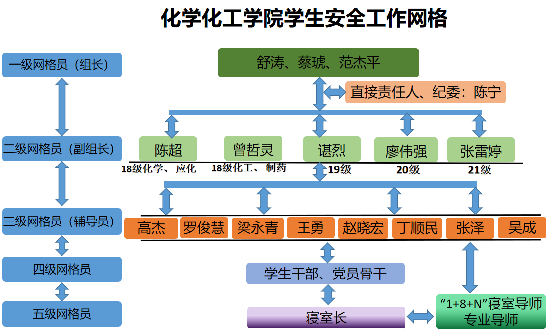 (1)学院党政学主要领导,(一级网格):对本学院学生安全工作负重要领导责任,负责统筹本学院学生安全工作。
