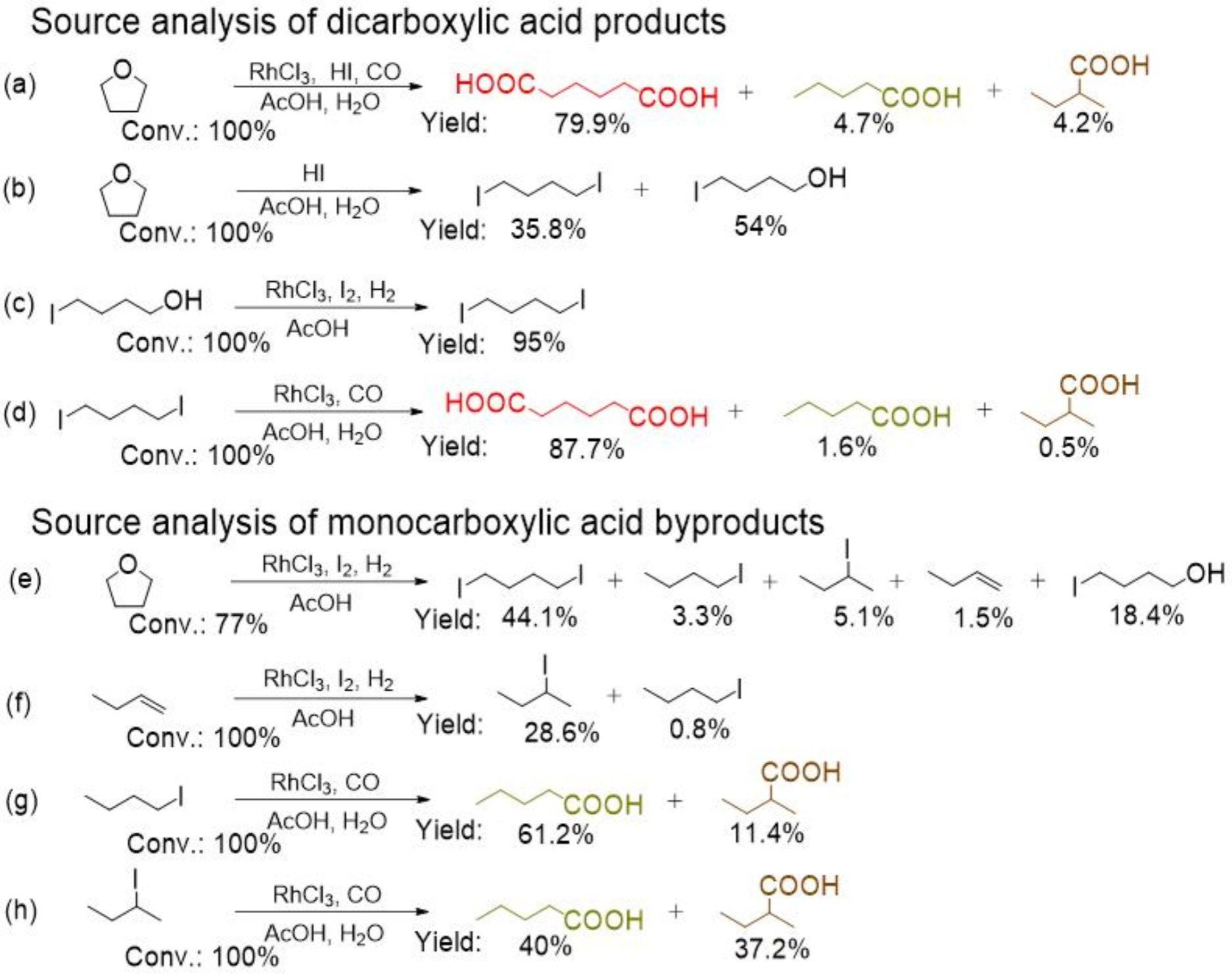 然后,作者做了一系列的对照控制实验,如图3所示,进一步阐明了1,4-二碘丁烷和4-碘-1-丁醇确实是反应的中间体,也是生成最终产物已二酸的关键。而单羧酸副产物的生成主要是因为生成了烯烃中间体。