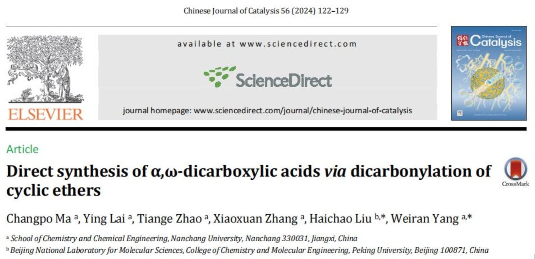 本网讯(化学化工学院)近日,南昌大学化学化工学院在催化领域知名期刊Chinese Journal of Catalysis(IF=""16.5)发表了题为“Direct"" synthesis of α,ω-dicarboxylic acids via dicarbonylation of cyclic ethers”的文章。南昌大学化学化工学院杨维冉教授和北京大学化学与分子工程学院刘海超教授为共同通讯作者,南昌大学化学化工学院2021级博士研究生马长坡为第一作者。