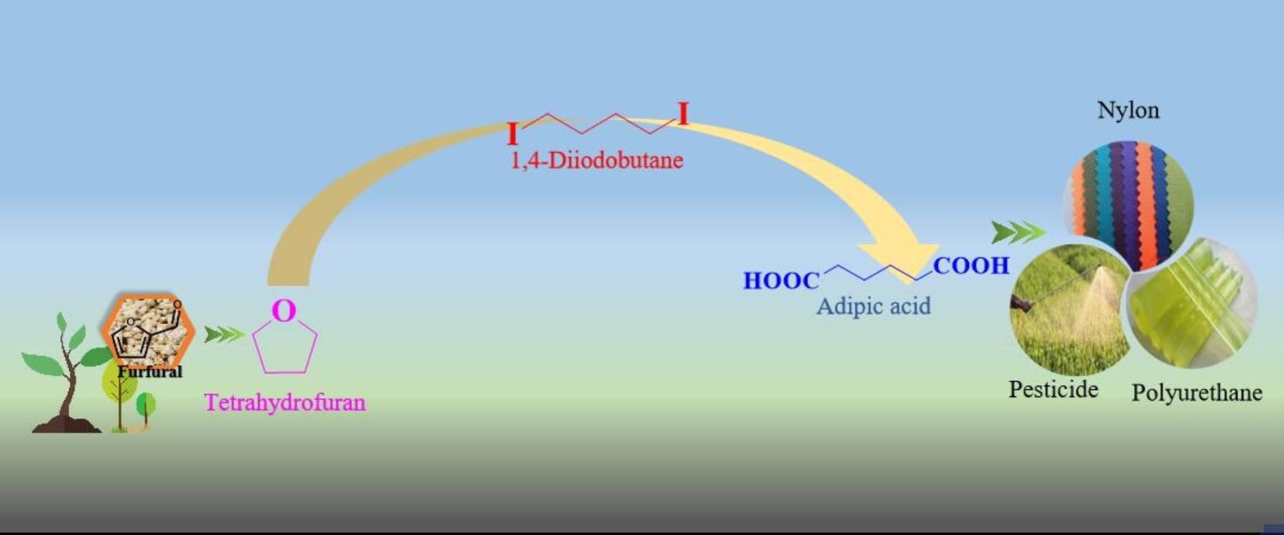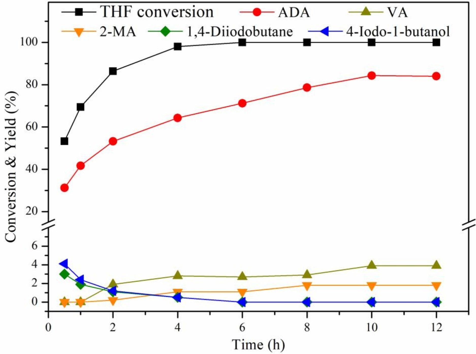 从生物质原料中可以很容易得到环醚和多元醇,如果能够利用它们为原料,通过双羰基化直接制备二元羧酸,将是非常有潜力的反应途径。遗憾的是,到目前为止,大多数已发表的文献报道由环醚或多元醇通过羰基化反应生成的产物主要是C+1单羧酸。其主要的反应路径是生成了烯烃中间体,进而形成了单碘代产物,进一步羰基化生成了单羧酸。我们课题组一直致力于碘催化在生物质衍生的多元醇加氢脱氧方面的研究,研究中发现在特定的反应条件下,多元醇可以选择性地形成多碘取代化合物的中间体。受到这一启发,杨维冉教授和刘海超教授开发了一种新的策略,通过由环醚或多元醇形成二碘代物中间体,然后直接通过双羰基化反应生成对应的C+2二羧酸。由于己二酸是最有用的二羧酸之一,特别是作为合成聚酰胺、尼龙-6,6的前体,研究团队重点研究了通过双羰基化反应直接从四氢呋喃(THF)合成己二酸的创新方法。在初步优化的反应条件下,以铑盐为催化剂,碘为促进剂,乙酸和水为混合溶剂,在170 °C,CO和H2条件下,THF可以以84%的产率得到己二酸。该催化体系适用于各种环醚和伯多元醇,可高效生成相应的C+2长链二羧酸。该方法为合成α,ω-二羧酸提供了一条有效的途径。