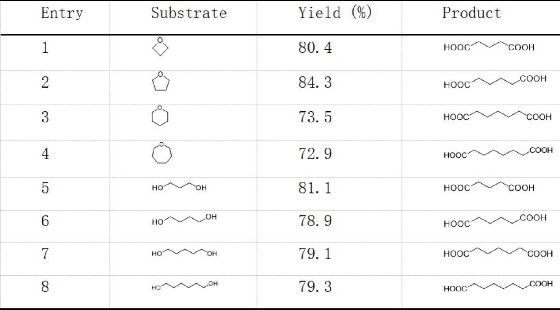 此催化体系还可以用于其它环醚和α,ω-二元醇底物(表1)。不同碳链长度的环醚和α,ω-二元醇底物(C3-C6)均取得了很好的对应C+2二元羧酸产物。其中庚二酸和辛二酸都是用其它方法很难合成的产物。