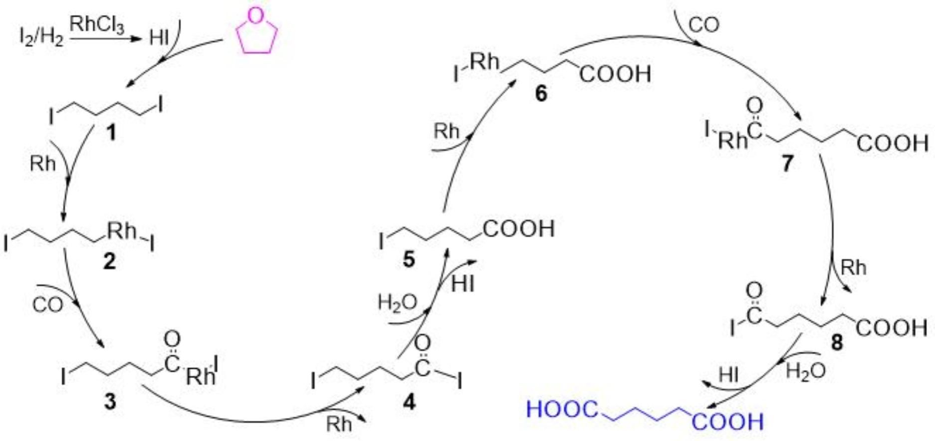 图4 提出的THF合成己二酸的二羰基化机理(注:Rh代表铑活性中心)