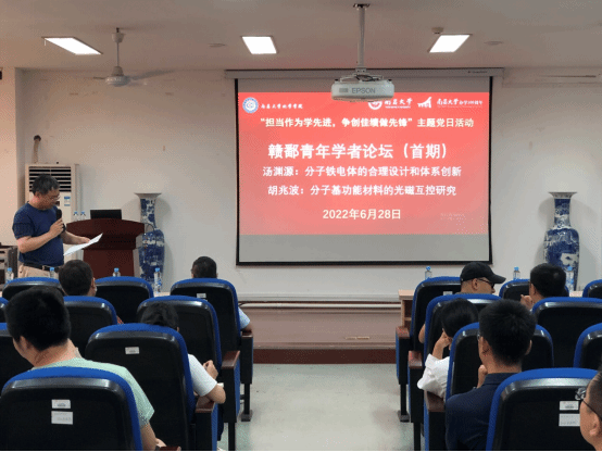 (化学化工学院 冯刚讯)为加强青年学者学术交流,增进青年师生对学术前沿的了解,培养科研创新思维和能力,以实际行动“牢记嘱托、勇毅前行”,6月28日下午,化学化工学院“双带头人”教师党支部书记工作室及教职工第二党支部开展“担当作为学先进、争创佳绩做先锋”主题党日活动,举办了化学化工学院首期赣鄱青年学者论坛。南昌大学青年教师汤渊源教授、江西理工大学青年教师胡兆波教授应邀作论坛主题报告,学院师生共100余人参与了本次活动。化学化工学院蔡琥院长和冯刚教授主持了论坛。