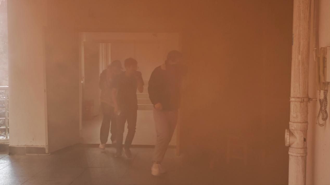 演练正式开始,随着模拟火源点燃,浓烟升起,尖锐的消防警报声瞬间响彻整个消防安全总指挥立即宣布启动消防应急预案。各楼层负责人迅速反应,按照预定疏散路线,引导同学们进入紧急疏散状态。同学们用湿毛巾等捂住口鼻,弯腰低姿,沿着墙壁一侧的疏散指示标志,快速、有序地从各安全出口撤离至指定的紧急集合点。