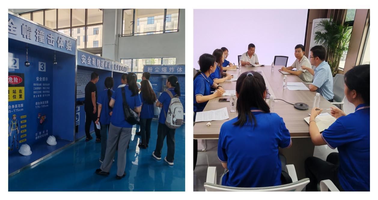 园区负责人现场解读江西省制造业重点产业链现代化建设“1269”行动计划,并与实践队成员就园区定位与发展规划、产业生态与要素保障、人才与创新等内容进行座谈,系统诠释了园区在江西省“1269”行动计划中的定位、发展现状及规划,特别是化工新材料、新能源材料、生物医药材料等领域的布局。实践队首次零距离接触庞大精密的仪器,沉浸式体验岗前培训、实操、消防及应急救援考试等相关内容,每登一层便被“层层有考点、处处即战场”的氛围震撼。在“园区重大安全风险防控应用支撑平台”大屏前,看着蓝色数字不断跳动——温度、压力、液位、可燃气体浓度实时预警,实践队深刻体悟“安全首位、绿色环保、科技赋能”的深层内涵,进一步坚定了以高水平安全护航高质量发展的专业自觉。