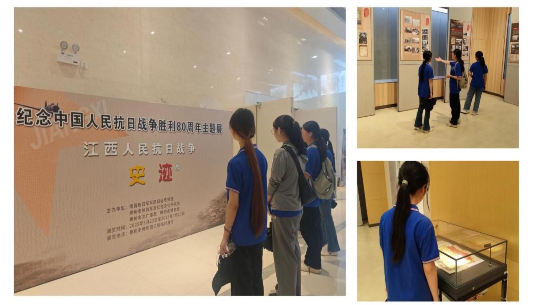 为深入学习贯彻习近平新时代中国特色社会主义思想和党的二十大精神,引导广大青年学生自觉听党话、跟党走,19日下午,实践队来到了“纪念中国人民抗日战争胜利80周年主题展(江西人民抗日战争史迹展)”,在“江西正面战场主要战役”“中国共产党领导的敌后抗日”等单位内容前驻足凝视,一幅幅珍贵图片、一件件斑驳实物,把同学们带回烽火岁月,让大家肃然起敬。