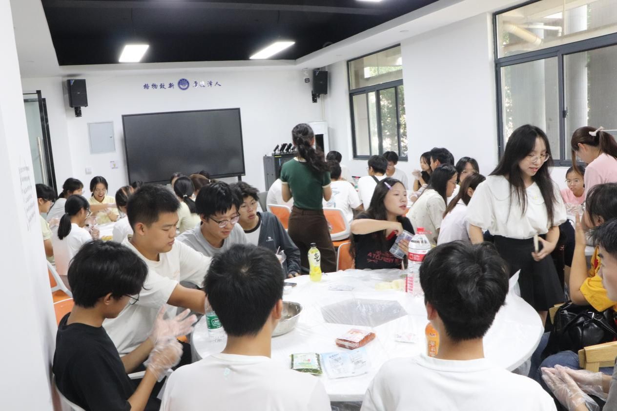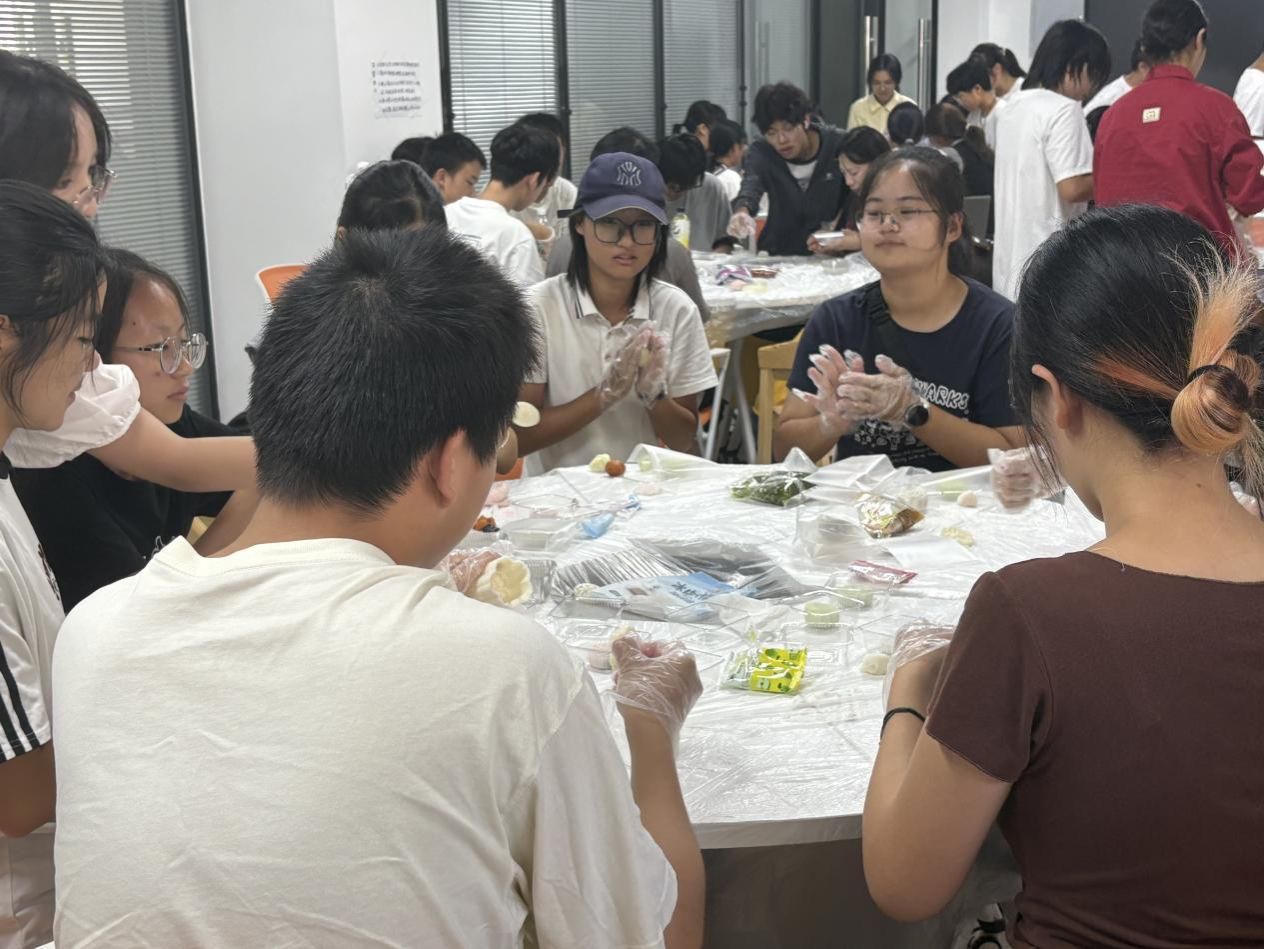 活动现场热闹非凡,欢声笑语回荡在25栋博雅厅的每一个角落。制作过程中,同学们纷纷展现出极高的热情和积极性。有的同学手法娴熟,揉面时力度均匀,面团在他们的手中仿佛有了生命,逐渐变得光滑而有弹性;有的同学则略显生疏,但在周围同学的耐心指导和帮助下,也渐渐掌握了技巧。在包馅环节,大家小心翼翼地将馅料包裹进面皮中,眼神专注,仿佛在雕琢一件珍贵的艺术品。压模时,同学们更是全神贯注,轻轻按压模具,一个个印着桂花、玉兔等传统纹样的冰皮月饼便从他们灵巧的指尖诞生,造型精致,尽显节日的独特韵味。