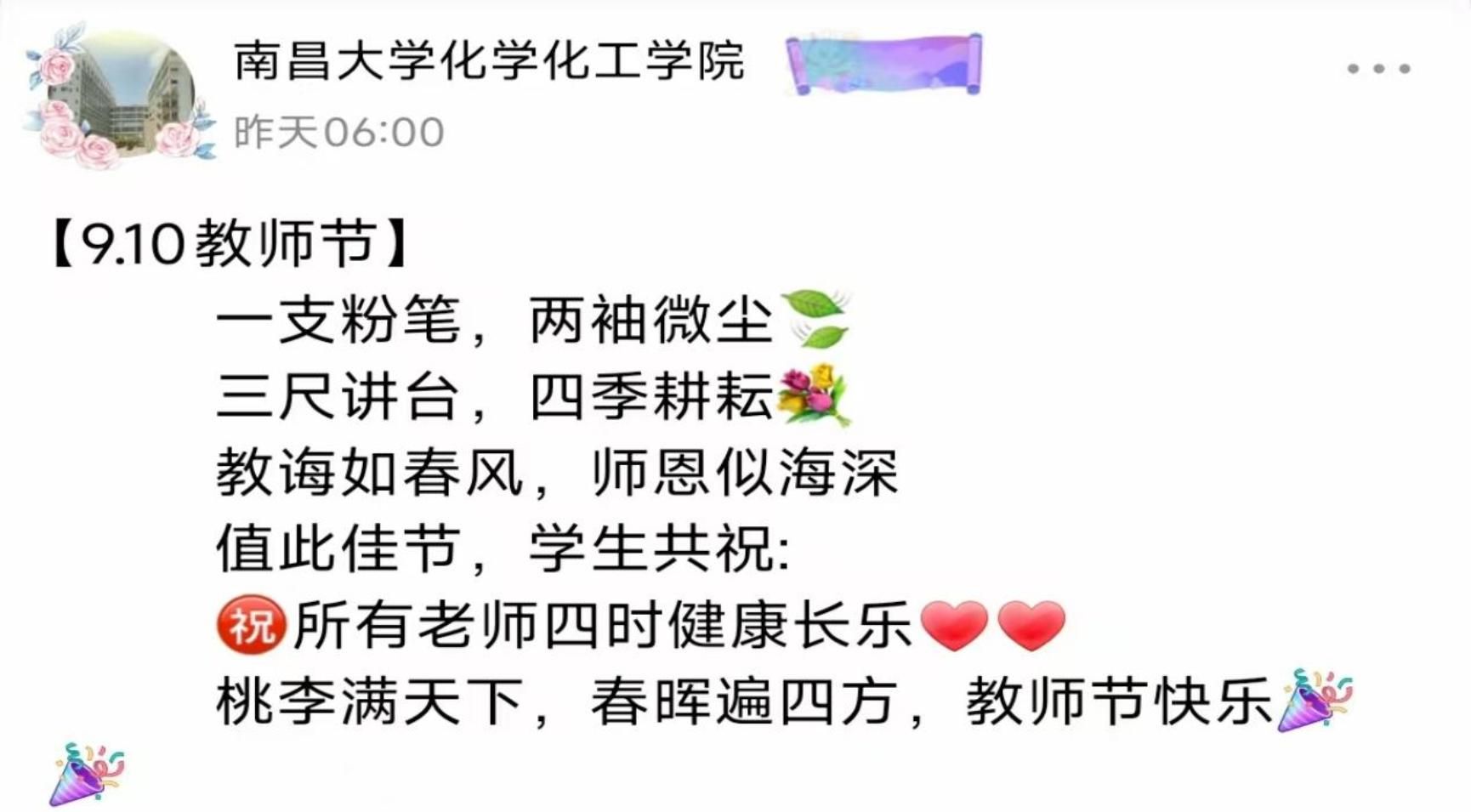 与此同时,化学化工学院官网也焕然一新,挂上了精美的教师节海报。海报上,中央“老师您辛苦了”六个大字遒劲有力、直击人心,搭配上温馨的图案,既彰显了学子对恩师的深切感激,也传递出学院对教师群体的高度尊崇。这一海报不仅在官网上展示,还通过学院的社交媒体平台进行广泛传播,让更多的人感受到了化学化工学院尊师重教的良好氛围。