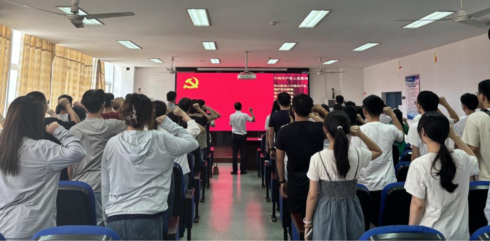 入党宣誓环节,在学院党委书记戴超领誓下,全体党员面向党旗庄严宣誓,以铿锵有力的誓言许下为共产主义事业奋斗终生的坚定承诺。