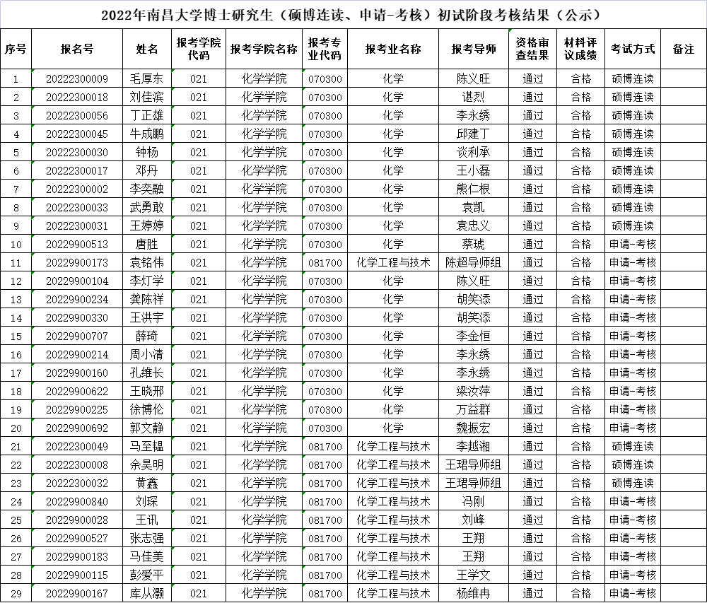 2022年南昌大学博士研究生(硕博连读、申请-考核)初试阶段考核结果(公示)