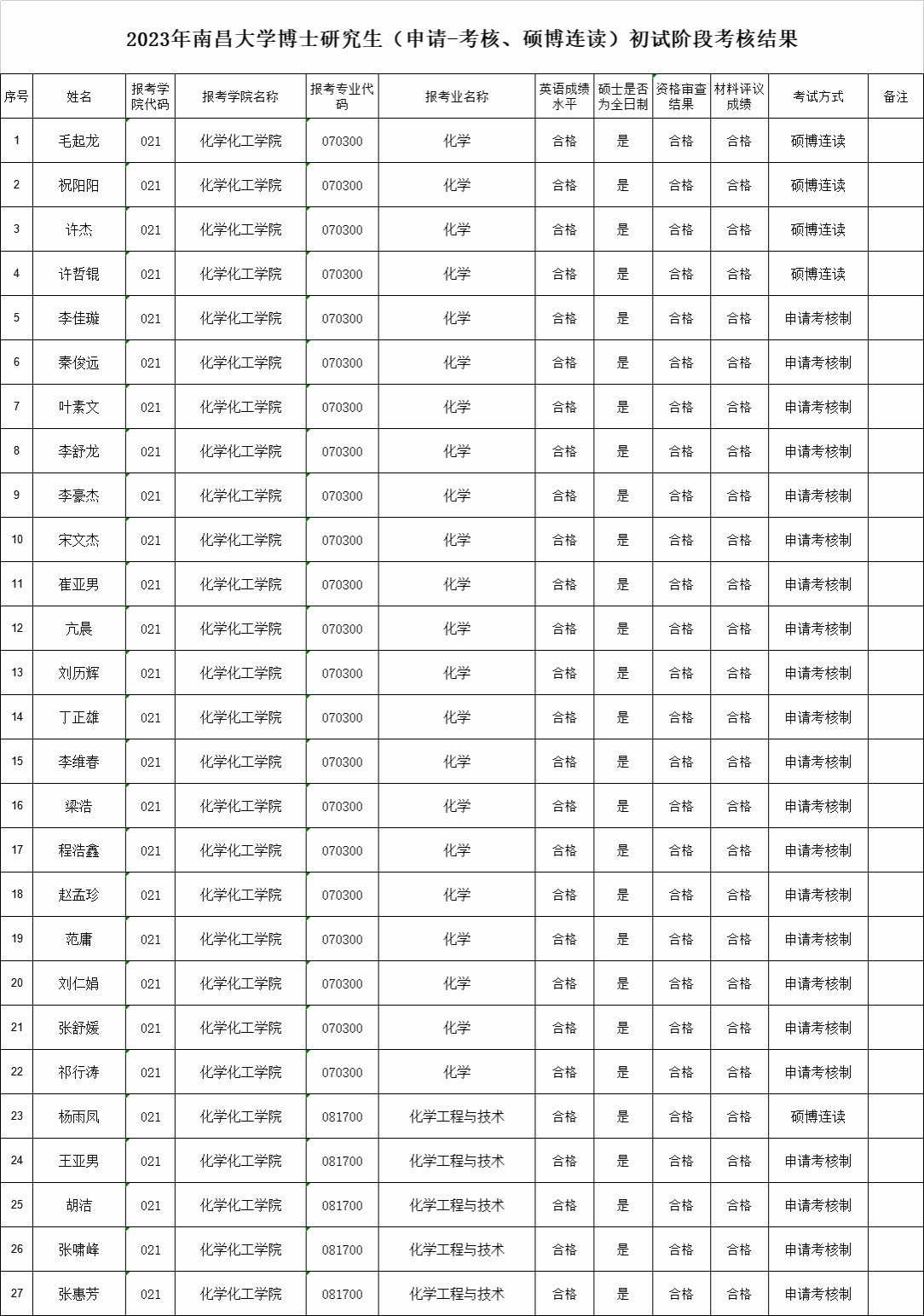 2023年南昌大学博士研究生(申请-考核、硕博连读)初试阶段考核结果公示