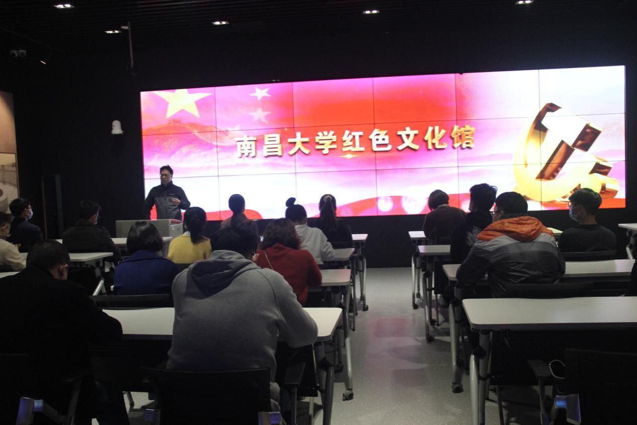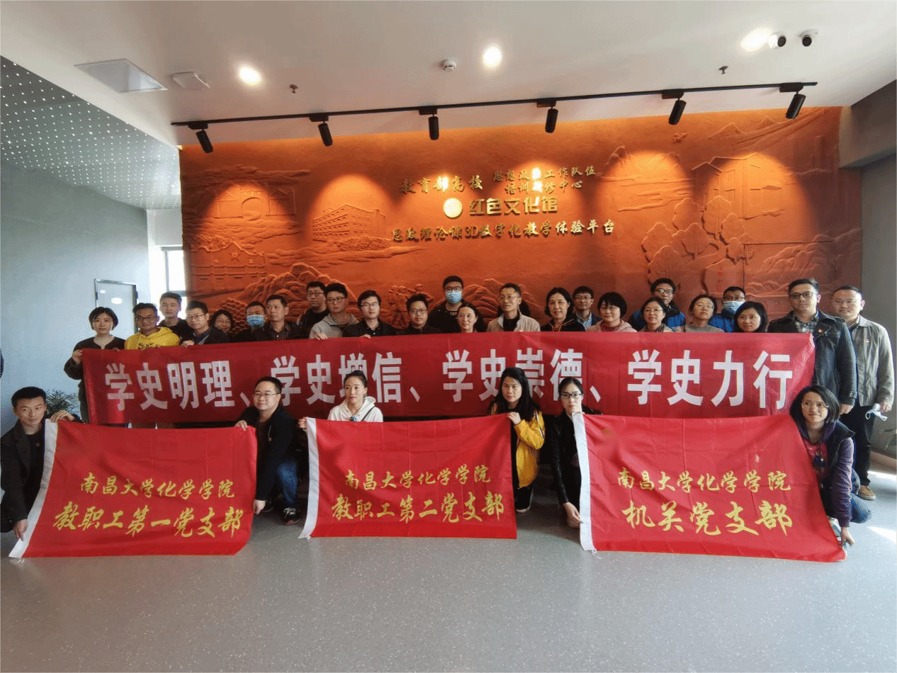 [南昌大学化学学院 张伟英讯]2021年3月25日,春风拂面,化学学院教职工第二党支部全体党员及学院各支部师生代表50余人在学院党委书记的带领下,来到教育部高校思政队伍研修基地南昌大学“红色文化馆”开展党史教育现场参观学习。映入眼帘的红色文化馆主题墙,记忆着江西在中国革命历史上“四个摇篮”和“两条小道”的重要作用:中国工人运动摇篮安源、共和国摇篮瑞金、人民军队摇篮南昌、中国革命摇篮井冈山,以及一条挑粮小道体现了老一辈无产阶级革命家身先士卒、率先垂范的高风亮节,一条小平小道更是走出中国改革开放的康庄大道。