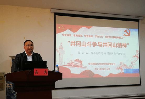 [化学学院 王振兴讯]“我们党的一百年,是矢志践行初心使命的一百年,是筚路蓝缕奠基立业的一百年,是创造辉煌开辟未来的一百年。”习近平总书记在党史学习教育动员大会上的重要讲话对党的百年历史所作出的这一精辟而又深刻的概括,醍醐灌顶,深化了我们对党史的认识,阐明了这次开展党史学习教育的意义、重点和要求。为进一步深入推进党史学习教育,南昌大学化学学院党委于2021年3月15日在理A302报告厅组织开展了党史学习教育动员会暨首场学习报告会,特邀中国井冈山干部学院肖小明教授为学院师生党员做了《井冈山斗争与井冈山精神》的专题报告。教育部全国党建工作样板支部和”双带头人”支部书记工作室--化学学院教职工第二党支部负责此次活动策划,学院党政班子成员、教职工及学生党支部的一百余名党员同志参加了此次学习。
