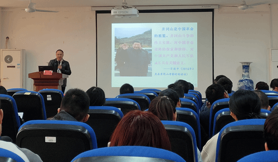之后,肖小明教授为全院师生党员作了《井冈山斗争与井冈山精神》的专题报告。肖教授首先从习近平总书记在党史学习教育动员会上的讲话谈起,并引用龚自珍的名言“欲知大道,必先为史;灭人之国,必先去其史”和苏联解体事件阐明了学习党史的重要性和必要性。接着,肖教授运用大量鲜活事例,从井冈山革命根据地的基本概况、井冈山革命根据地的历史划分、井冈山革命根据地的曲折发展、井冈山革命根据地的后期斗争等方面回顾了井冈山革命的峥嵘岁月,生动诠释了“坚定执着追理想、实事求是闯新路、艰苦奋斗攻难关、依靠群众求胜利”的伟大井冈山精神。学院师生党员的心灵一次次被震撼,情绪一次次被感染,精神一次次被洗礼,内心一次次被折服。通过肖小明教授的精彩讲座,学院师生党员全面了解了井冈山革命斗争的艰难历程及其重要历史地位;重温峥嵘历史,老师们感慨万千,深受震撼,对井冈山精神、对中国革命、对毛泽东、朱德等老一辈无产阶级革命家有了深刻的认识和体会。