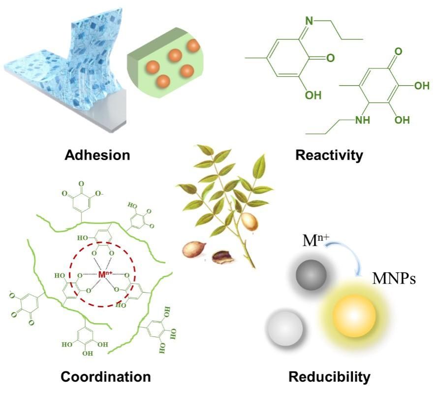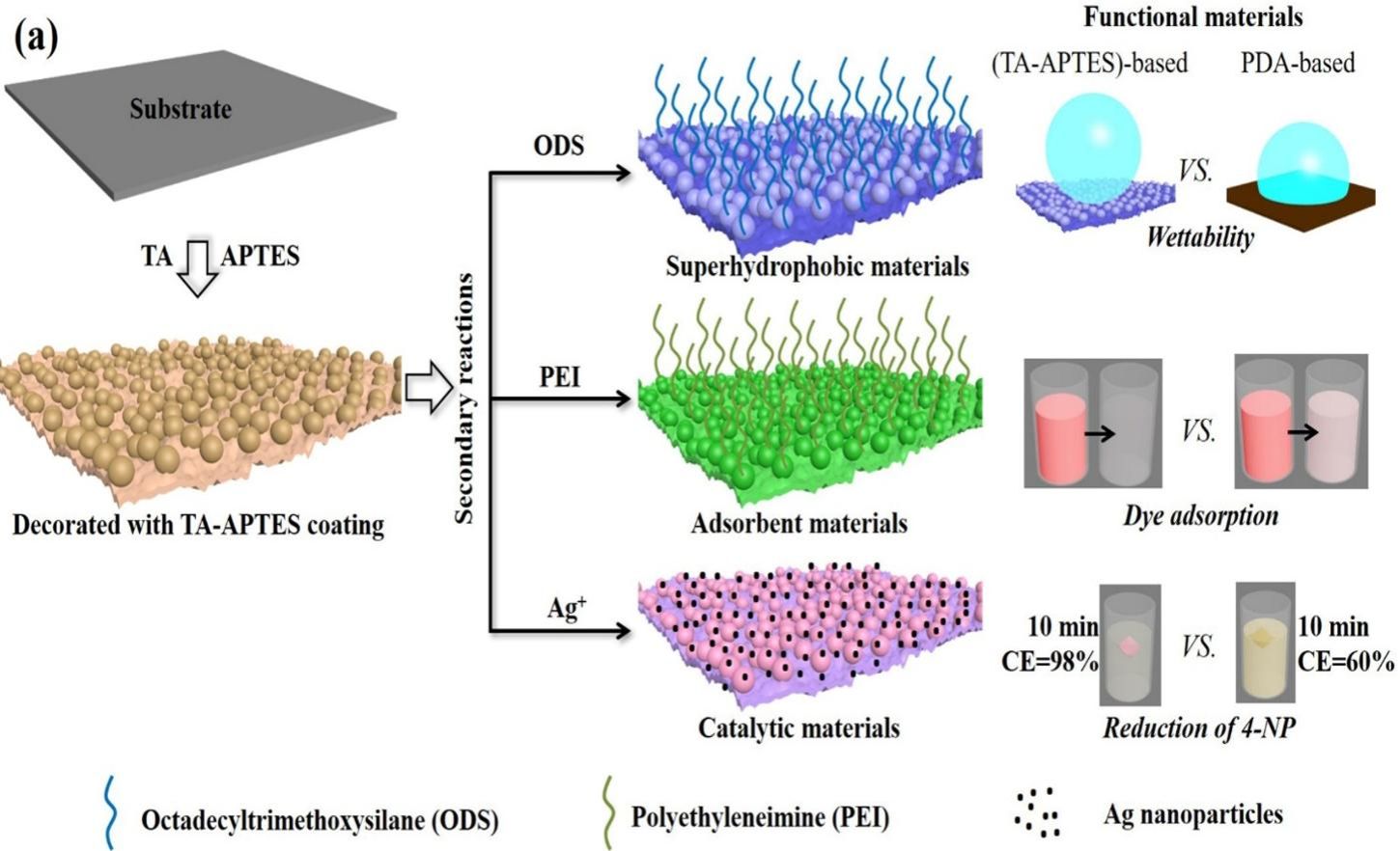 (4)Chemical Engineering Journal , 2019, 360, 299-312;在本文中,命名了TA-APTES涂层,展示了该涂层的二次反应活性,其在制备高性能吸附材料,催化材料和超疏水材料方面表现出比聚多巴胺涂层(PDA)更为优异的性能,同时其价格比聚多巴胺涂层低廉,有望取代聚多巴胺涂层。