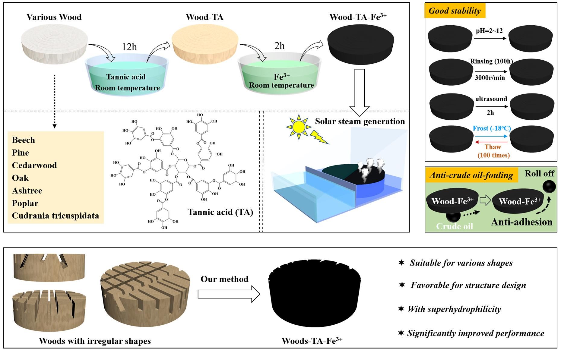 (7)Nano Energy,2020,71,104650. 第一次报道利用TA和Fe3+直接改性各种木材,使其具备光热性能;该文还考察了光热水蒸发材料在处理乳化油方面的潜在应用。上述两篇Nano Energy论文极大推动了 多酚-Fe 在光热水蒸发领域的应用。