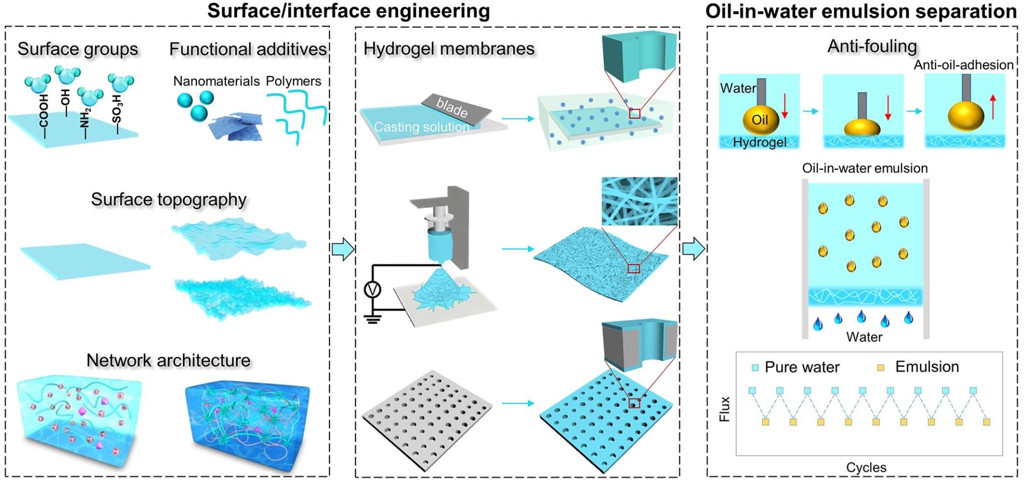4. Surface engineering of filter membranes with hydrogels for oil-in-water emulsion separation, Separation and Purification Technology, 2023, 304, 122340. (详细介绍了近年来水凝胶改性微滤膜的主要策略,及其提高分离膜抗油污染,尤其是抗高粘度油污染方面的应用)