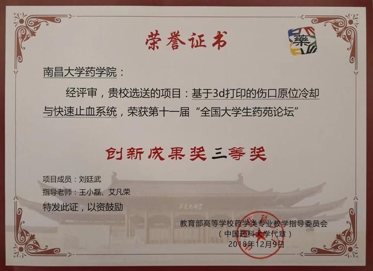 8. 王小磊、艾凡荣、刘廷武,基于3D打印的伤口原位冷却与快速止血系统, 第十一届“全国大学生药苑论坛”创新成果奖,三等奖,2018