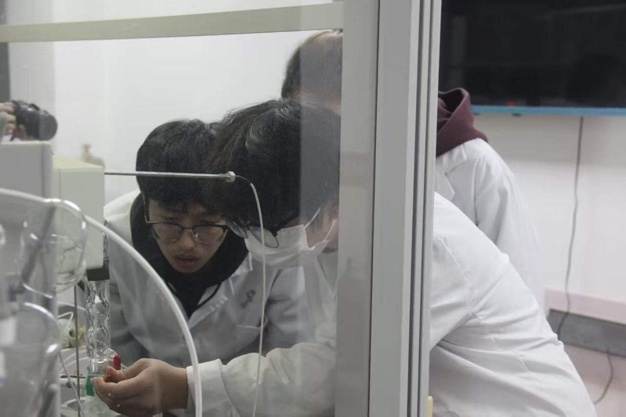 赛事进程中,指导教师胡昱和吕小兰依托实验终端,实时监测各小组的操作规范与数据偏差情况。他们目光敏锐,不放过任何一个可能影响实验结果的关键细节。针对装置气密性检测等关键细节,指导教师精准、及时给予指导,他们既为实验安全筑牢了防线,更引导选手在规范操作中深化对实验原理的理解,在修正数据偏差的过程中迭代实验设计思路,最终实现了操作技能与理论认知的同步提升。