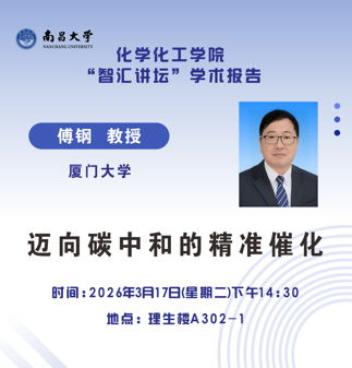 报告题目:迈向碳中和的精准催化报 告 人: 傅钢 教授(厦门大学)时间:2026年3月17日(星期二)下午14:30地点:理生楼A302-1报告人简介:傅钢,现为厦门大学化学化工学院副院长,表界面化学全国重点实验室副主任,教授,博士生导师,研究领域是纳米表界面催化的理论研究。2018年获得国家自然科学奖二等奖《金属纳米材料的表面配位化学》(R3),在Science (3篇)、Nature (1篇)、Nature子刊 (10篇)、 J. Am. Chem. Soc. (6篇)、 Angew....