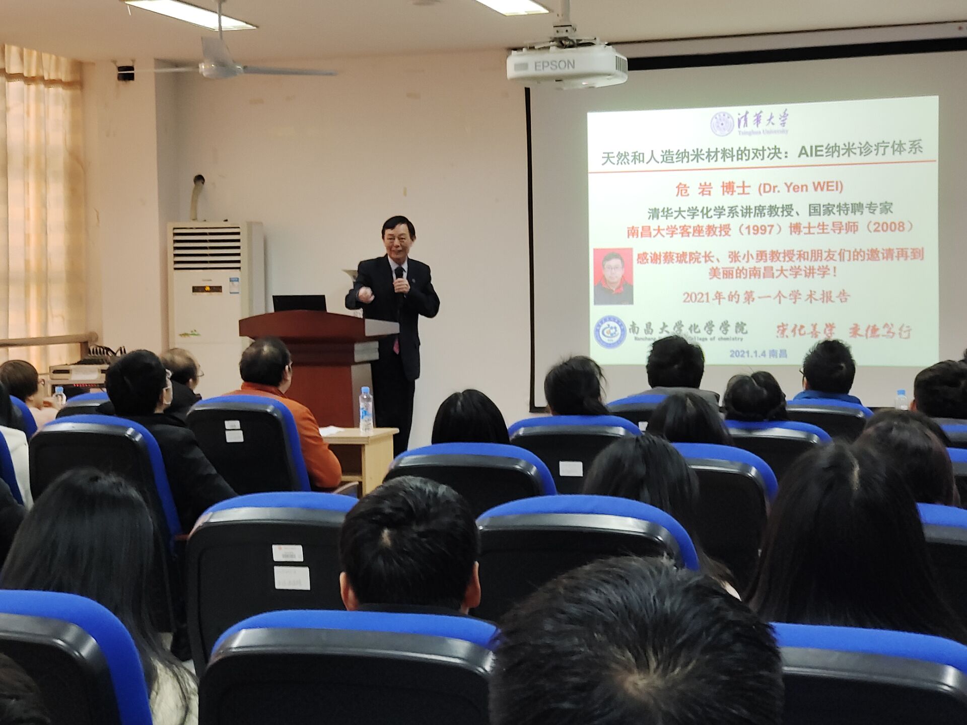 应南昌大学化学学院邀请,清华大学危岩教授于14日(星期一)在我院多功能厅作了题为《天然和人造纳米材料的对决:AIE纳米诊疗体系》的学术报告。危岩教授介绍了聚集诱导发光(AIE研究现状和背景,针对AIE分子在生物医学研究的难点和挑战;分享了他们近期AIE探针构建方法、AIE多模成像探针设计与制备3D打印AIE功能材料AIE纳米探针肿瘤长时间示踪以及荧光成像/肿瘤光热、光动力学治疗方面的研究进展。在此基础上,危岩教授针对国家在化学、化工与材料方面卡脖子的问题和在场的师生进行了交流和讨论,勉励大家静心学习,努力拼搏;为中国梦早日实现贡献我们化学人的力量。化学学院师生一百余人聆听了学术报告,现场气氛热烈。报告结束后,危教授与师生进行了交流,与大家一起分享了他的研究心得和体会;特别是针对年轻教师职业发展过程中的困惑提出了自己的意见和建议。