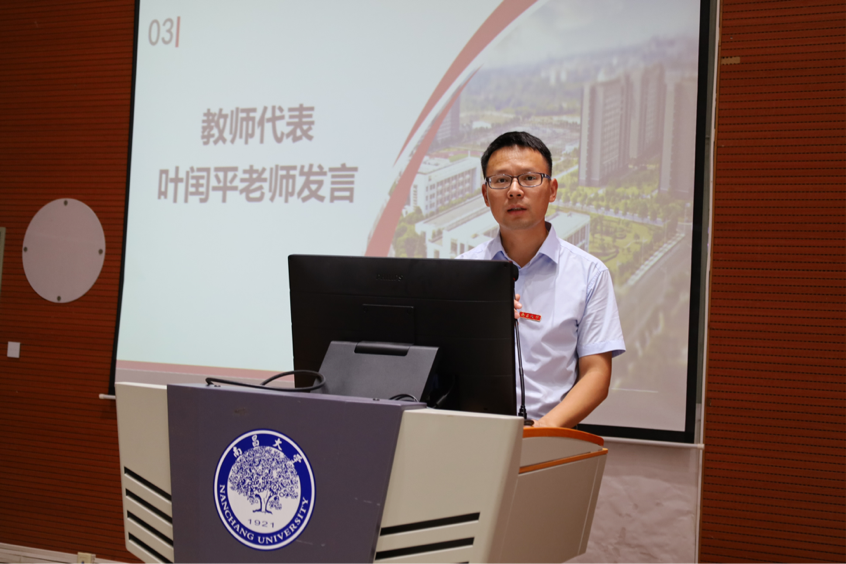 教师代表叶闰平教授结合自身科研经历,向新生提出切实的学术建议:强调时间管理的重要性,鼓励积极与导师沟通,推行“双轨制实验”研究模式,并借助人工智能与化学交叉融合的实例,启发大家打破学科壁垒、深化钻研精神。