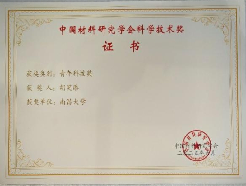 我院胡笑添教授荣获2025年度中国材料研究学会科学技术奖-青年科技奖