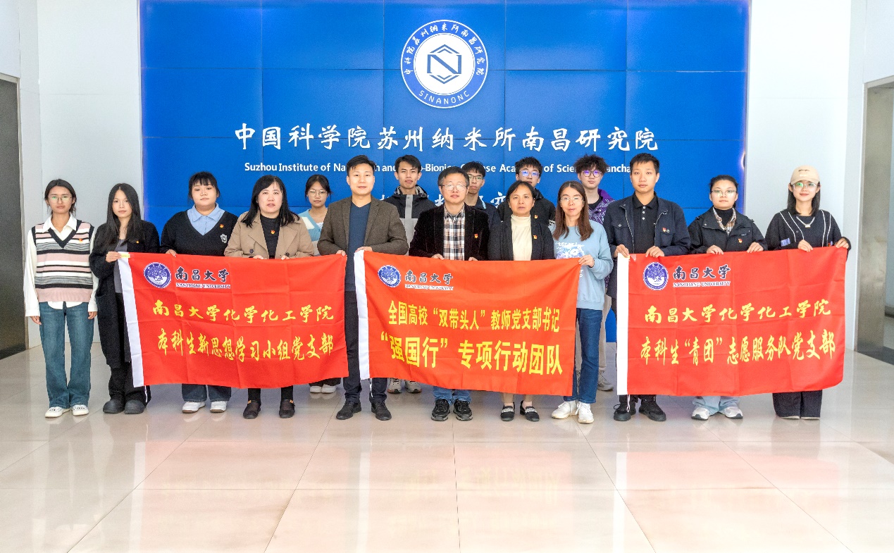 化学化工学院讯,尹康寿报道)为深入贯彻落实教育部、省委教育工委关于高校“双带头人”培育工作的安排部署和“双带头人”教师党支部书记“强国行”专项行动要求,充分发挥高校“双带头人”的示范引领作用,不断提升党支部的凝聚力和战斗力。2024年11月7日,南昌大学化学化工学院“强国行”专项行动本科生党支部赴江西省纳米技术研究院(原中国科学院苏州纳米所南昌研究院,以下简称研究院)开展党建共建暨“强国行”专项行动并座谈交流。